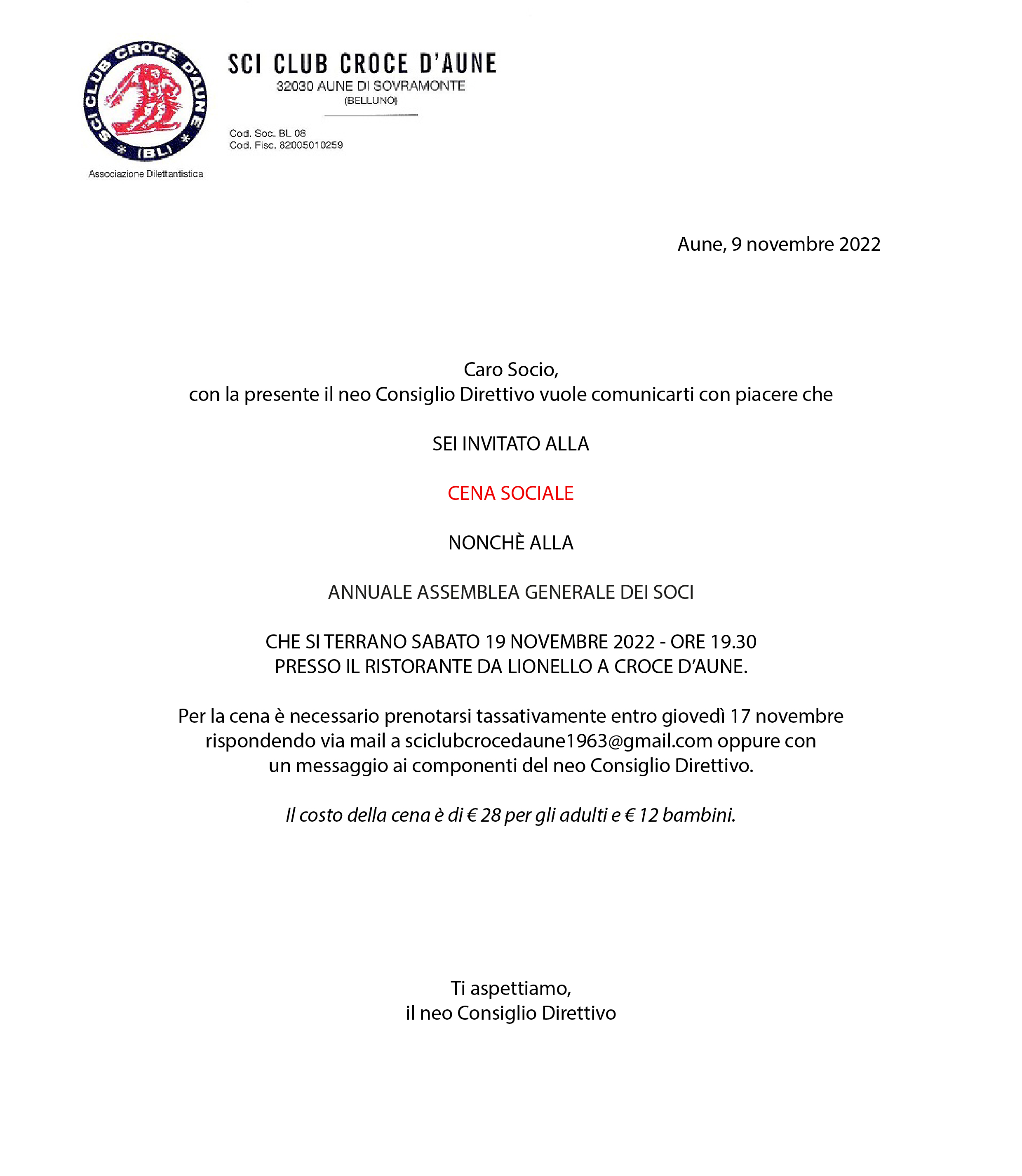 La stagione invernale è oramai vicina e come da consuetudine lo Sci Club Croce d’Aune invita soci e amici alla cena sociale, nonchè alla assemblea generale dei soci, il giorno 19 novembre 2022 alle ore 19.30 presso l’Albergo e ristorante Croce d’Aune alla località passo Croce d’Aune. Per la cena è necessario prenotarsi come da invito sottostante.